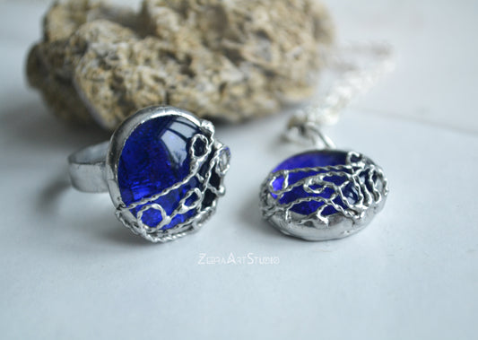 Blue glass jewelry set, Pendant and ring